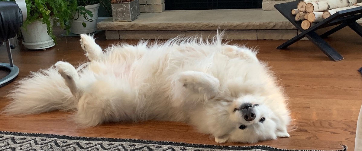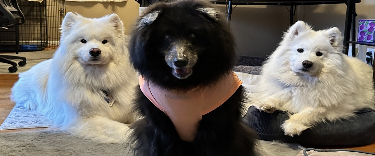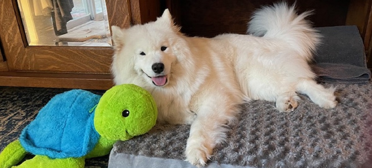 Two years ago I started fostering SugarBear from St. Louis Samoyed Rescue. The first couple of months were challenging as we got to know each other in. This handsome boy has become a wonderful companion as we go on walks and enjoy retirement.