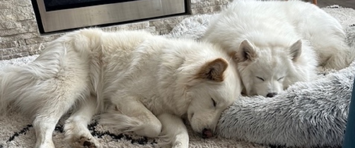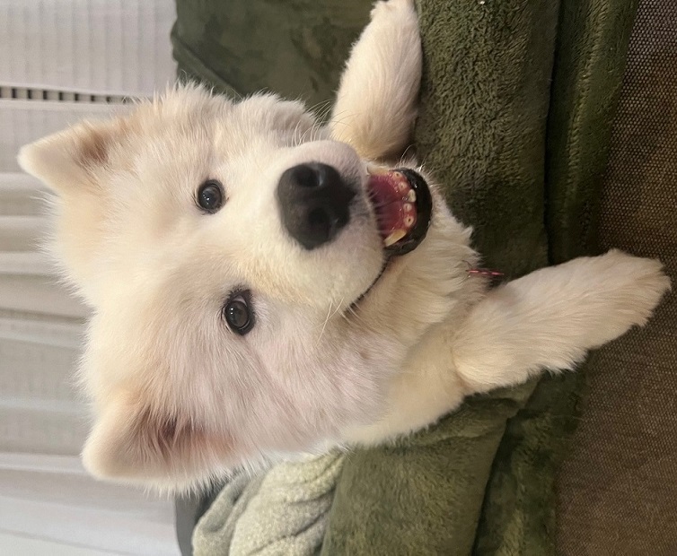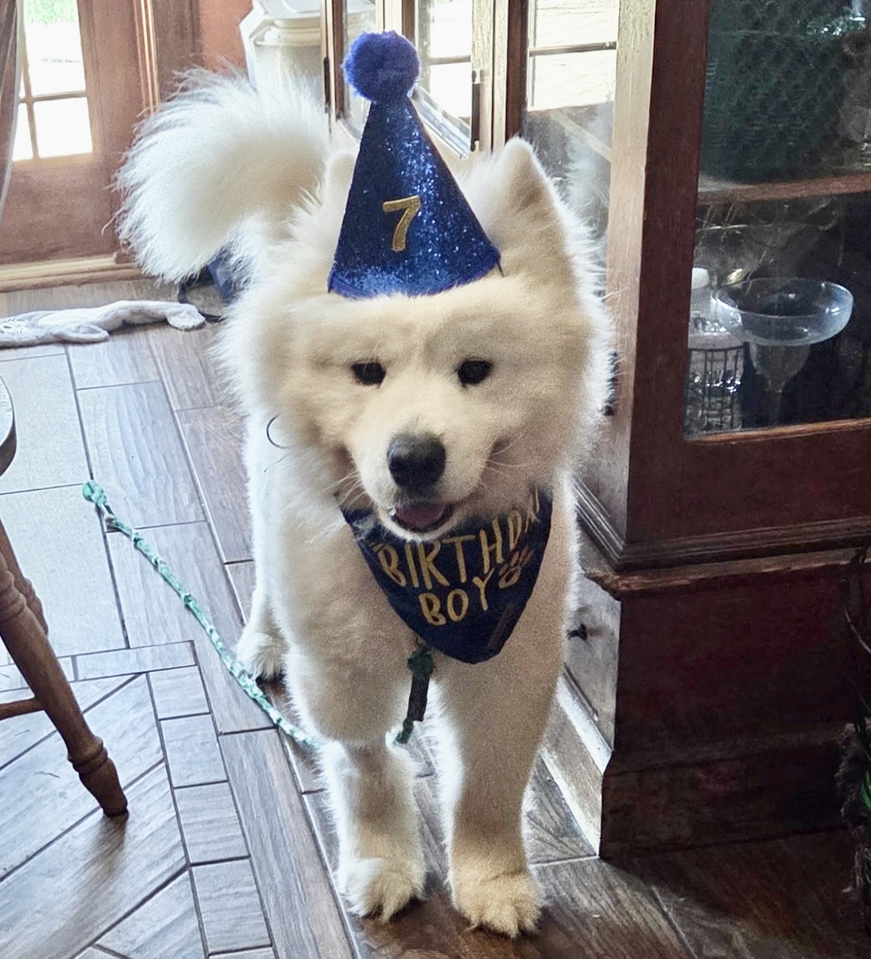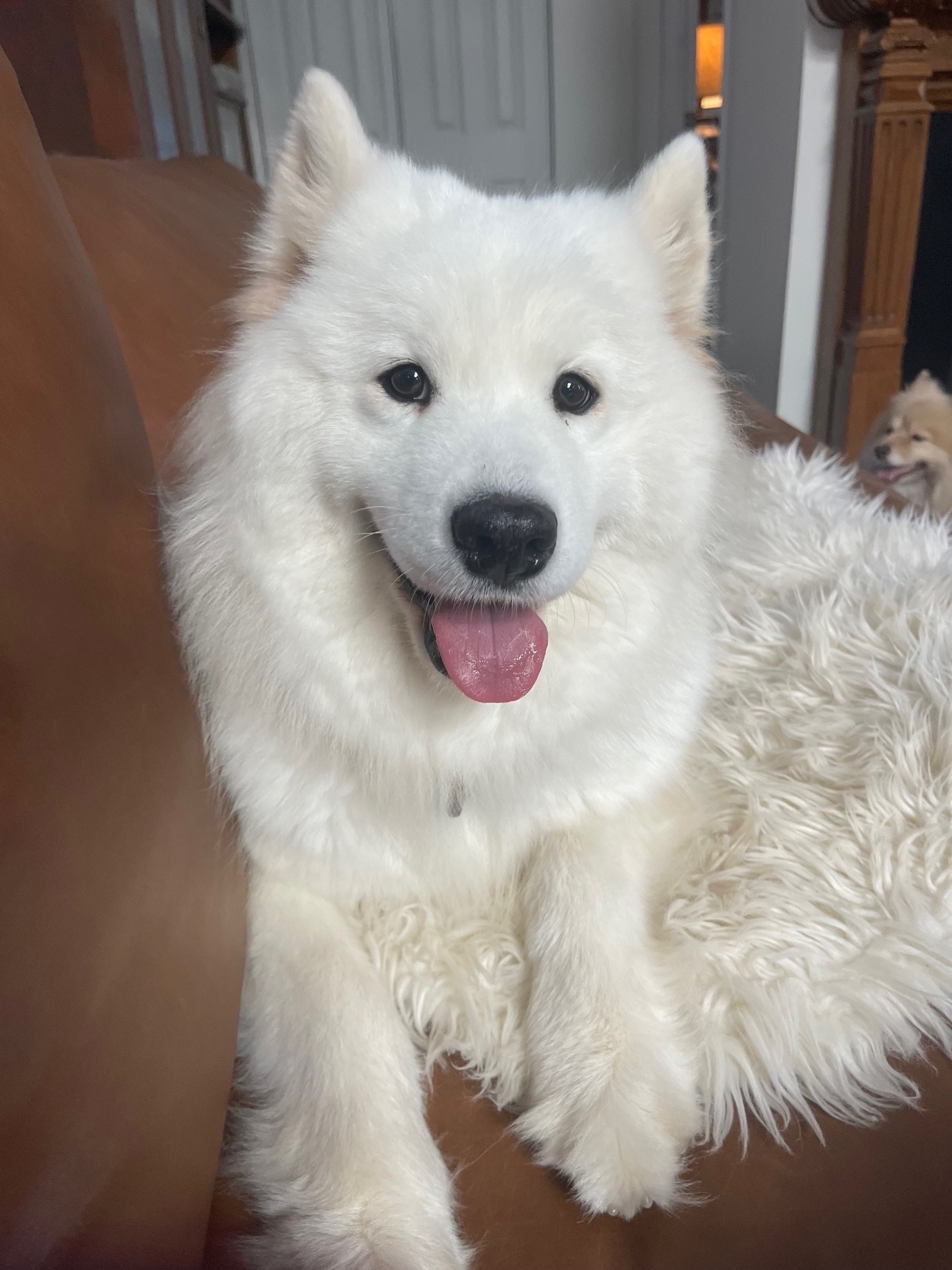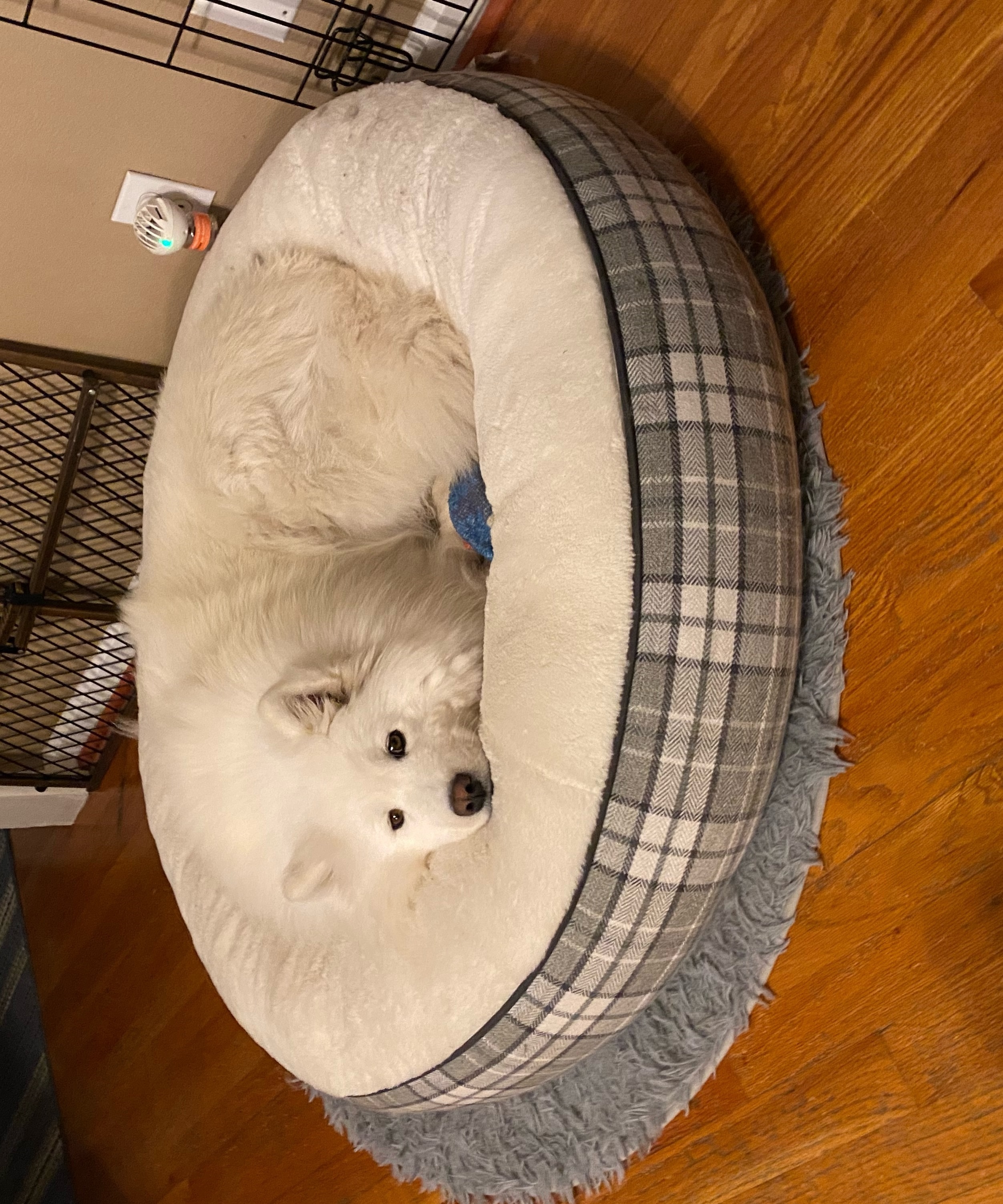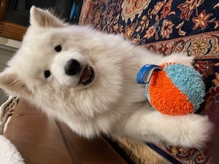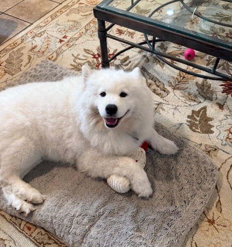 The McNamee family had recently lost their 14 year old Scout who was also a St. Louis Samoyed Rescue alumni, rescued in 2013. “It was perfect timing when we learned about Simba”, said Vicki McNamee, secretary for the rescue. “It was a week before school started so we didn’t hesitate to say yes to fostering Simba.” He acclimated to the family and their routines very quickly. He’s sweet, talkative and a true Samoyed male. Every morning he goes into wake his human brother for school, jumps on the bed and gives him a big kiss. About three weeks into fostering, he was a foster fail, no one could imagine having to give him up. Simba was officially adopted in September 2021. From Vicki, ”I’m so grateful to have Simba in our family. Thanks to the woman who contacted our rescue, the shelter and wonderful transport volunteers for getting Simba to us! He is a wonderful dog with a lot of life to live and love to give!”