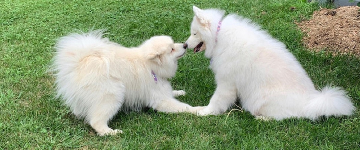 Mimi came into SLSR from a central Illinois shelter in the Summer of 2018. She got to ride with several Samoyed rescuers on a transport over to SLSR. We were told by the shelter that her vision was not great, and she may have some eye issues. We got her right into the vet and some eye specialists. After lots of phone calls, board discussions, and vet opinions, we found out that Mimi is blind in one eye and has a very, very limited amount of vision in her other eye, but she may be able to see shapes of some sort. The vet staff fell in love with Mimi (not surprisingly!) and one of the vets asked to foster her while she was in their care. The next thing we knew, one of the vet techs asked to adopt Mimi. What a perfect pair! She takes Mimi to work with her every day, so she is able to give Mimi her eye medication, which is needed multiple times a day, and if Mimi has any additional eye issues, she is in good hands! Mimi lives with her black lab brother and her hooman in St. Louis.