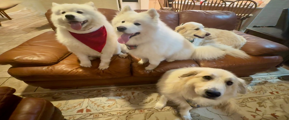 Blossom and Rose are two sisters who came to SLSR thru National Mill Dog Rescue from a puppy mill in Missouri. Blossom and Rose were puppy mill mamas for years. They only knew life living in cages and having puppies.. Blossom went to a SLSR foster home, where she was given medical care, grooming, lots of love, and learned what it’s like to be a real dog! Blossom has been adopted (Happy Tails!) and is in her forever home with an amazing couple who adores her! Blossom also gets to hang out with other Sammies and Pyrenees, so they are quite a handful when it comes to vacuuming time!