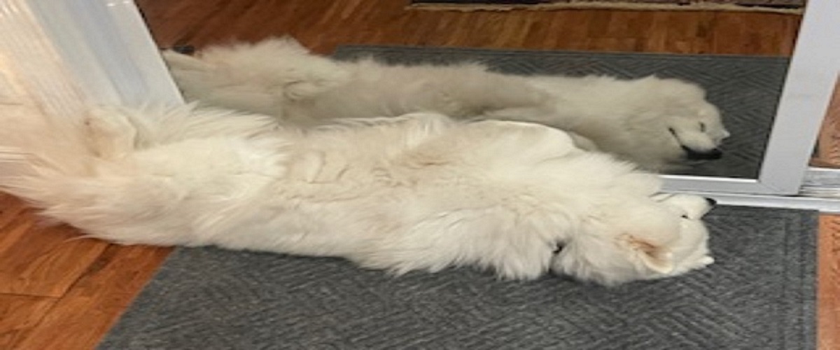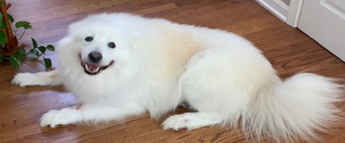 Duke, an 11 year old Samoyed who came to St. Louis Samoyed Rescue on May 7, 2022. He was found by local authorities as a stray in a rural area outside of Kansas City. He was quickly identified by his former groomer in a photo she saw posted. Apparently Duke lived with two brothers, one who was tragically killed in a motorcycle accident. After several attempts to contact the owner by the authorities, his rescuer reached out to SLSR for help. Duke came to us with a large fatty tumor on his chest and a small tumor on his eye lid which were removed. In addition, his teeth were cleaned, nails trimmed, a full blood panel was done, he was given pain medication and all of his vaccinations are now up to date. Duke is currently in a foster home with an SLSR Board Member. He is very sweet and grateful to her for taking him in. She said he is a loving, attentive addition to her life. Duke knows she is smitten with him! He has quite a personality and loves to go shopping on the counters to see if there are any goodies his foster mom may have left. Although he is very careful not to damage anything he does sometimes hit the jackpot. Some successful Duke raids result in shared guilt; Duke for getting caught and his foster mom for being outwitted by Duke.