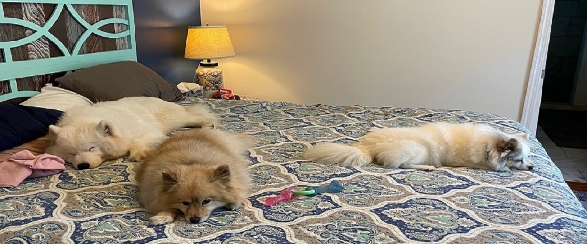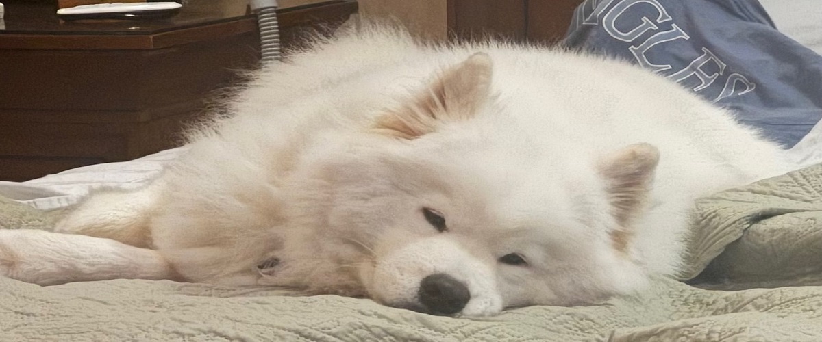 The McNamee family had recently lost their 14 year old Scout who was also a St. Louis Samoyed Rescue alumni, rescued in 2013. “It was perfect timing when we learned about Simba”, said Vicki McNamee, secretary for the rescue. “It was a week before school started so we didn’t hesitate to say yes to fostering Simba.” He acclimated to the family and their routines very quickly. He’s sweet, talkative and a true Samoyed male. Every morning he goes into wake his human brother for school, jumps on the bed and gives him a big kiss. About three weeks into fostering, he was a foster fail, no one could imagine having to give him up. Simba was officially adopted in September 2021. From Vicki, ”I’m so grateful to have Simba in our family. Thanks to the woman who contacted our rescue, the shelter and wonderful transport volunteers for getting Simba to us! He is a wonderful dog with a lot of life to live and love to give!”