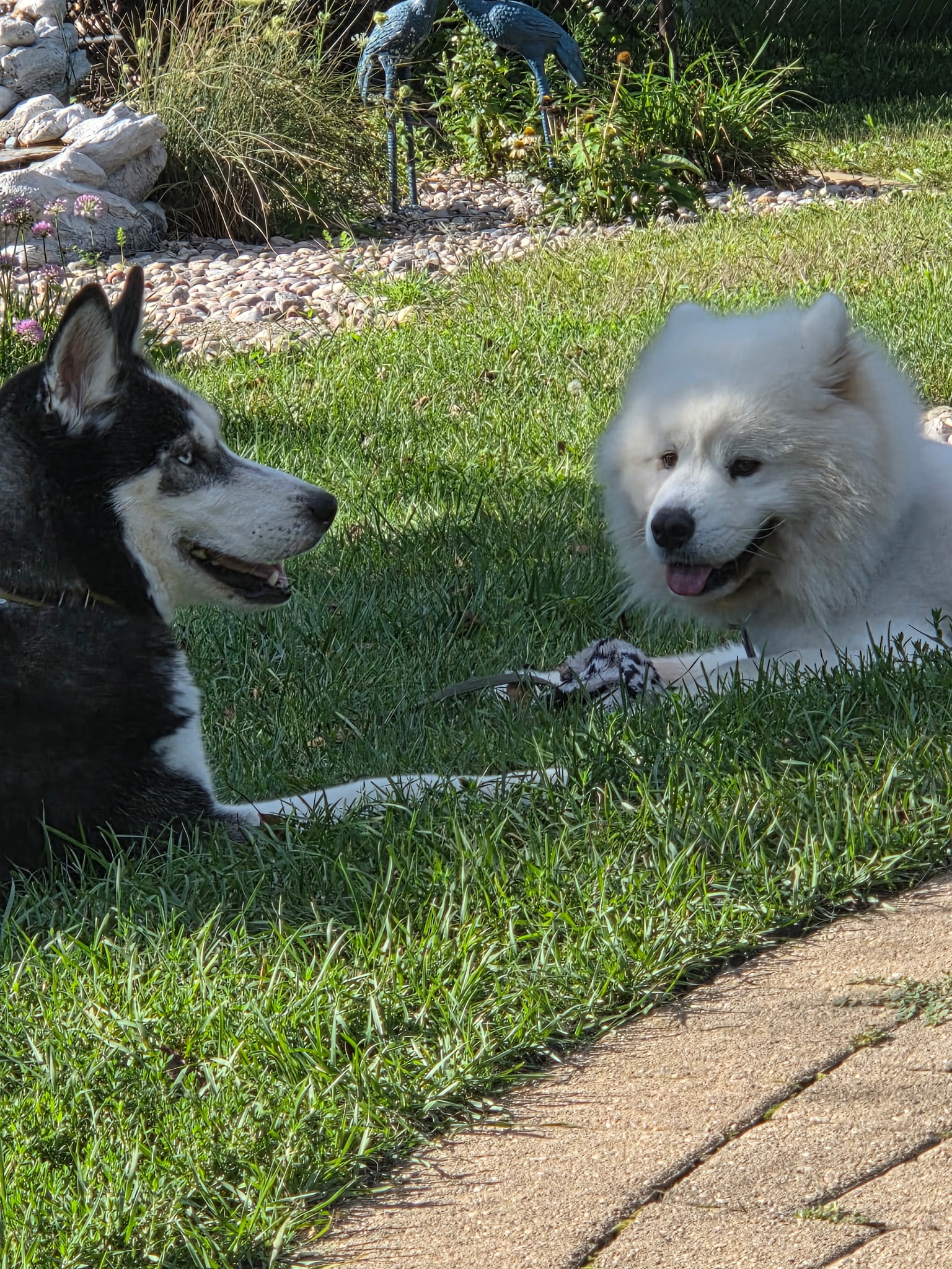 Rose and Blossom are two sisters that came into SLSR thru National Mill Dog Rescue after being released from a puppy mill. Rose went to an amazing short-term foster home until we found a long-term foster home for Rose. Rose is currently in a foster home with another female Sammie, whom she loves and adores and loves to groom! Rose loves her foster family, including her two-legged foster brothers! Rose has come a long way from being scared, skittish, and terrified outside of the puppy mill cages she knew. Rose is still working through a behavioral issue called pica. Rose's pica causes her to try to eat anything and everything on the ground from cigarette butts to toys to mulch. Rose‘s foster family is doing an amazing job keeping her safe, working to break her of this behavior, and loving her!