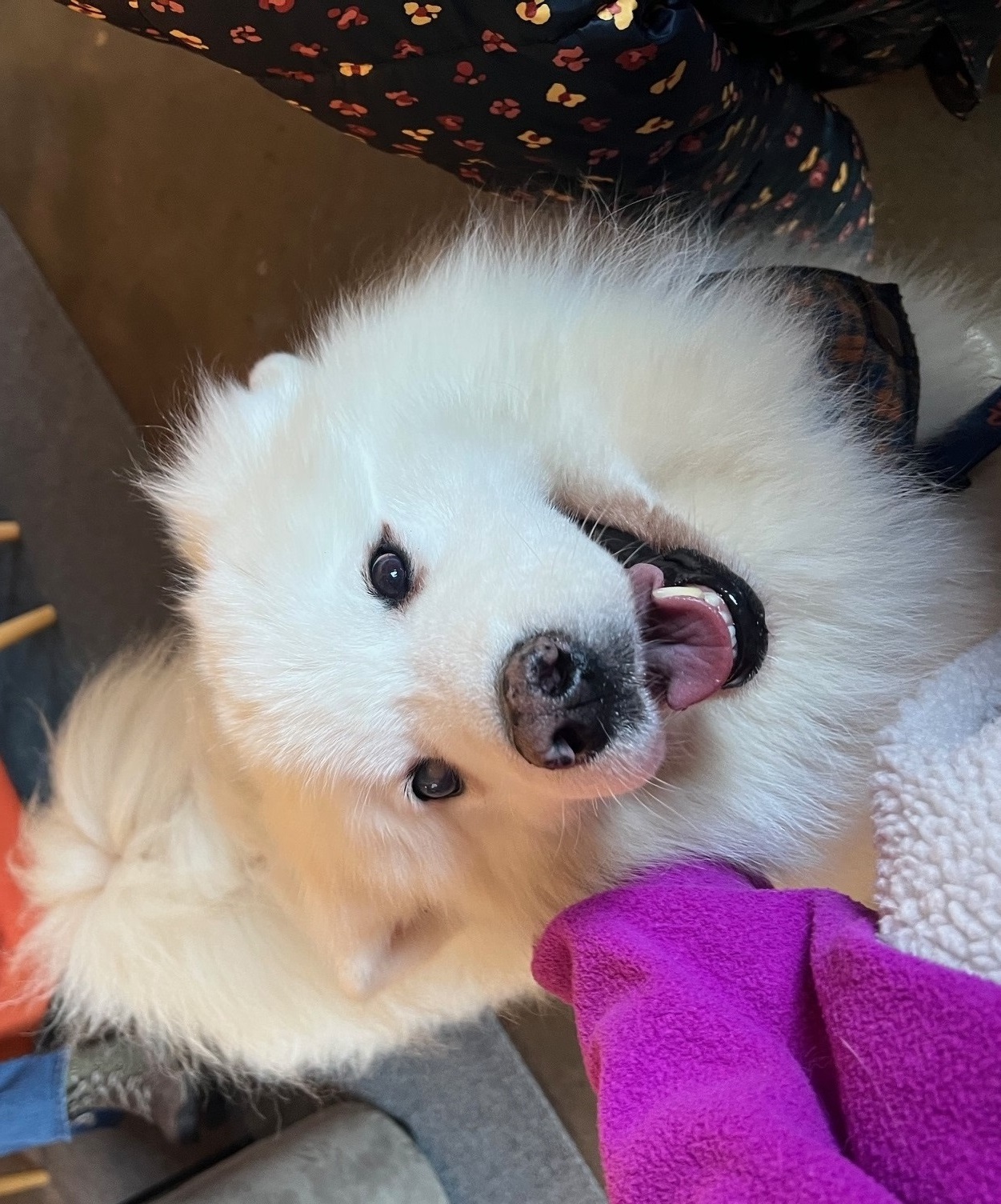 Charlie is a sweet adult Sammy who was released after six years in a puppy mill. Charlie was kept in a cage and used purely for breeding. Charlie has the normal skittish and shyness that we see in puppy mill dogs. Charlie’s foster family has been working with Charlie in training classes, at home, and on family trips to help him gain more confidence and be the dog they know he can be! Charlie has come a long way, but is still working through some triggers and fear from his puppy mill days of having no socialization and living 24/7 in a cage. Charlie is learning what a loving home is thanks to his dedicated foster family and four-legged foster sibilings!